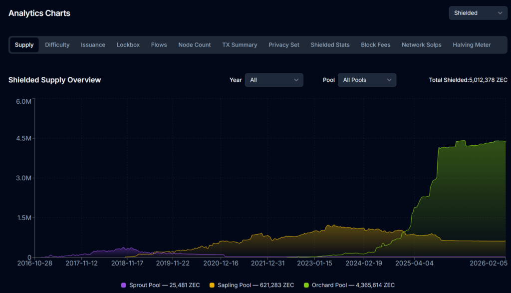 • ZEC shielded supply is stabilizing around 5,000 ZEC and hasn’t flinched in this bear market, showing users still care about private transactions. .