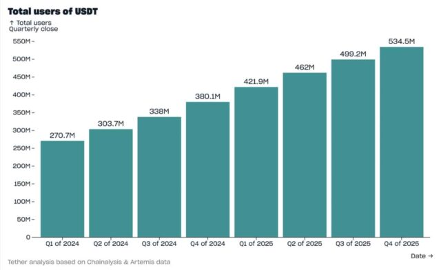 User adoption went parabolic: Tether added 35.2 million new users in Q4 alone, pushing the estimated global total to 534.5 million (eighth straight quarter smashing 30M+ adds).