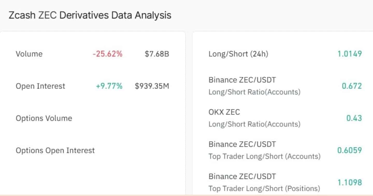 Futures activity also picked up. CoinGlass data shows Zcash open interest rose about 9.8% to $939.31M, suggesting more money is flowing into ZEC futures.