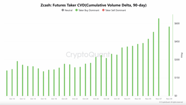 Zcash has been gaining traction over the past month. Futures activity picked up sharply, and Futures Taker CVD stayed positive for 30 days straight, a sign that buyers have been in control.