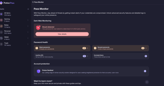 Inside the app, you have a few features that aren’t available through the extension. The key feature is Pass Monitor, which is Proton’s security watchdog feature. It’ll show you weak passwords, accounts where you can enable 2FA, and critically, accounts that have been victims of a data breach. If you want to go further, you can turn on Proton Sentinel, as well.