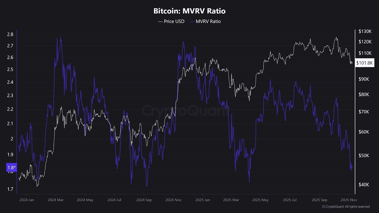 Market analyst Crypto Crib noted that BTC’s Market Value to Realized Value (MVRV) ratio has risen to about 1.8. In past cycles, similar readings came before rebounds of roughly 30%–50%.