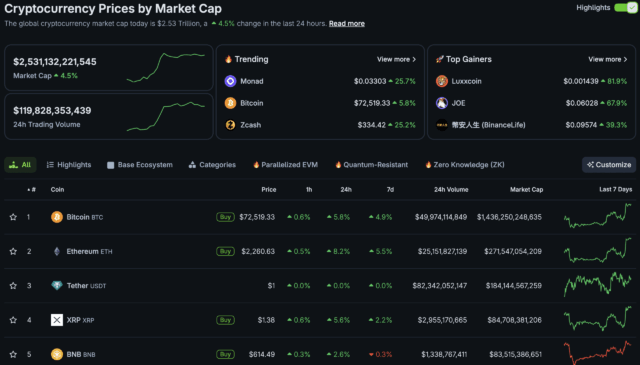 Crypto continues to flourish following news of a ceasefire between Iran and the US, with the combined market cap back over its crucial $2.5 trillion level, which has often served as a springboard for a run toward $3 trillion. BTC USD continues to lead the way with another +6% daily pump, taking it to $72,500.
