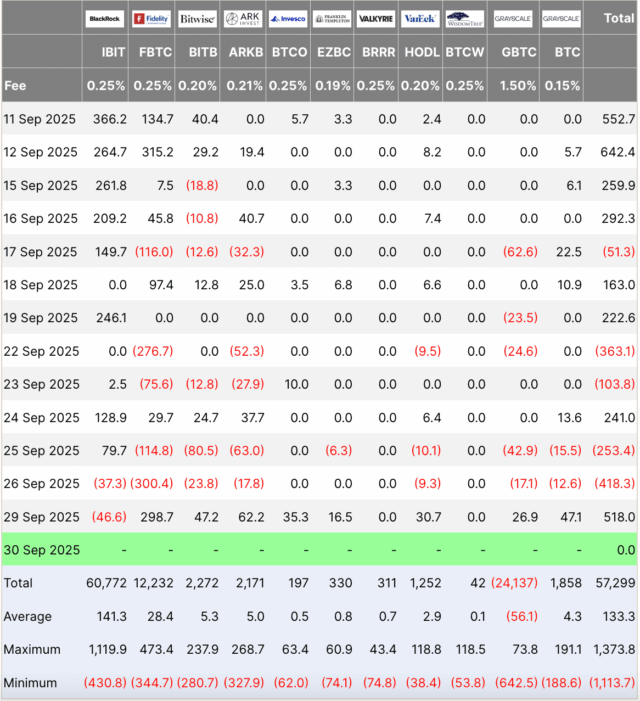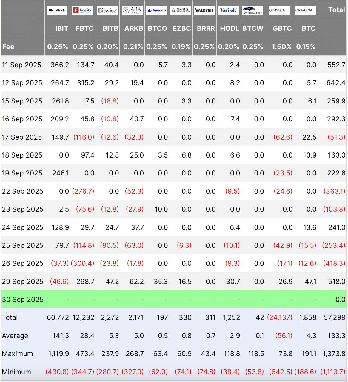 According to Farside investors’ data, US spot Bitcoin funds recorded a net +$518M inflow on Sept. 29, the strongest daily intake of the week, partly offsetting earlier outflows.