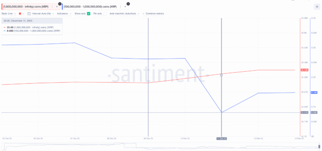 Blockchain data now shows renewed buying from major XRP holders. Wallets holding more than 1Bn tokens increased their combined balances from 25.36Bn on December 9 to 25.42Bn.